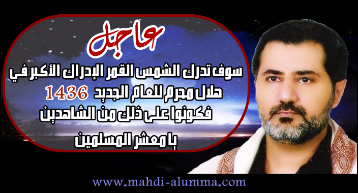 فليترقب الجميع متى اكتمال البدر لشهر محرم لعامكم هذا 1436 ولسوف نقيم الحجّة على علماء الفلك بكل المقاييس بإذن الله في هلال محرم وصفر حتى يتبيّن لهم أنه الحقّ ويتفاجأوا بما لم يكونوا يحتسبوا من الإبدار المبكر للقمر لعله يحدث لهم ذكراً. واقترب الوعد الحقّ وإنّه لنبأ عظيمٌ وهم عنه معرضون، فالفرار الفرار إلى الله الواحد القهّار قبل أن يسبق الليل النهار، فاتقواالله يا أولي الأبصار فوالله ثم والله ثم والله إنّه قد أدركت الشمس القمر الإدراك الأكبر في شهر محرم الحرام لعامكم هذا 1436، ولسوف تعلمون ما نقصد بفتوانا الإدراك الأكبر، وسوف يتبيّن الحقّ للجميع بإذن الله.